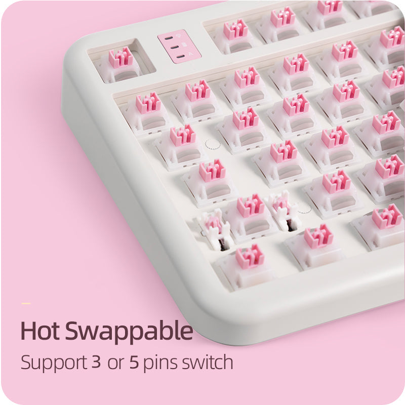 - Hot-Swappable: The keyboard is fully hot-swappable, compatible with 3-pin or 5-pin mechanical switches, allowing users to customize the typing experience without soldering.