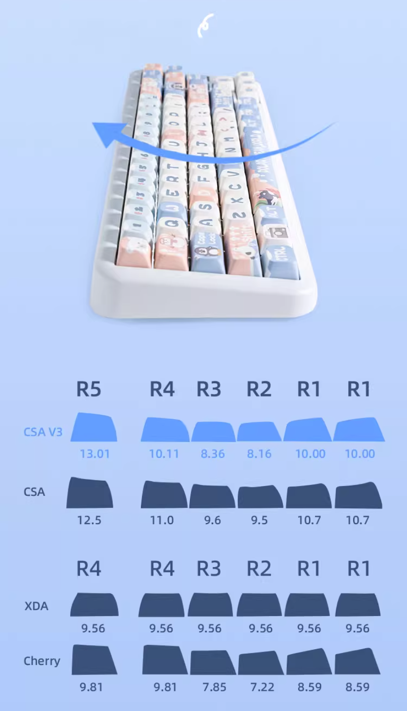 CSA V3 Profile: The keycaps follow the CSA V3 profile, which is a specific sculpting of the keycap's shape that offers a comfortable typing feel. This profile is designed to fit the natural curves of your fingers, enhancing the overall comfort and ergonomics during extended typing sessions.