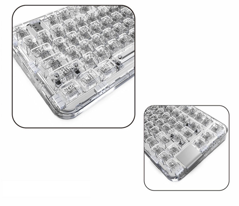Transparent PC Keycaps: The keyboard features 142 keys, all of which are made from transparent polycarbonate (PC) material. This gives the keyboard a unique, clear aesthetic that allows the lighting effects, if any, to shine through the keycaps.