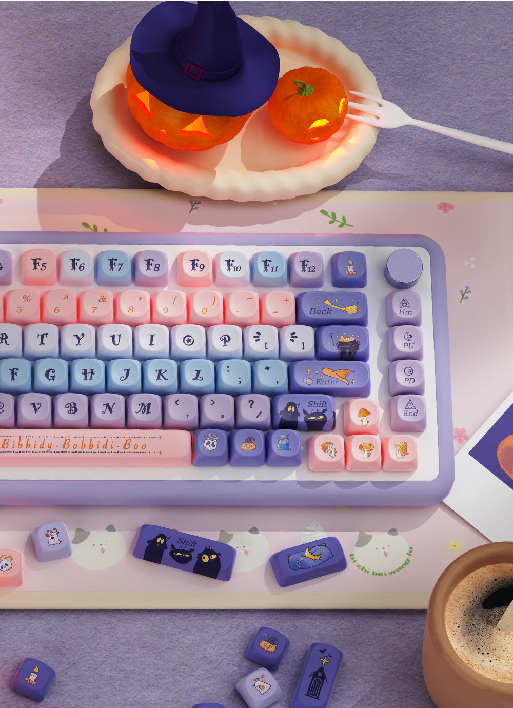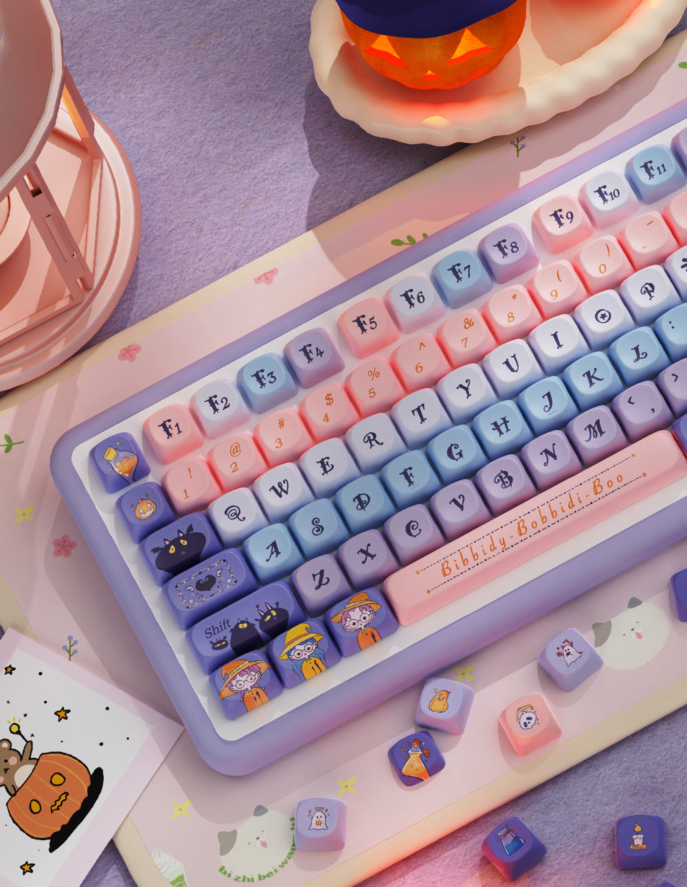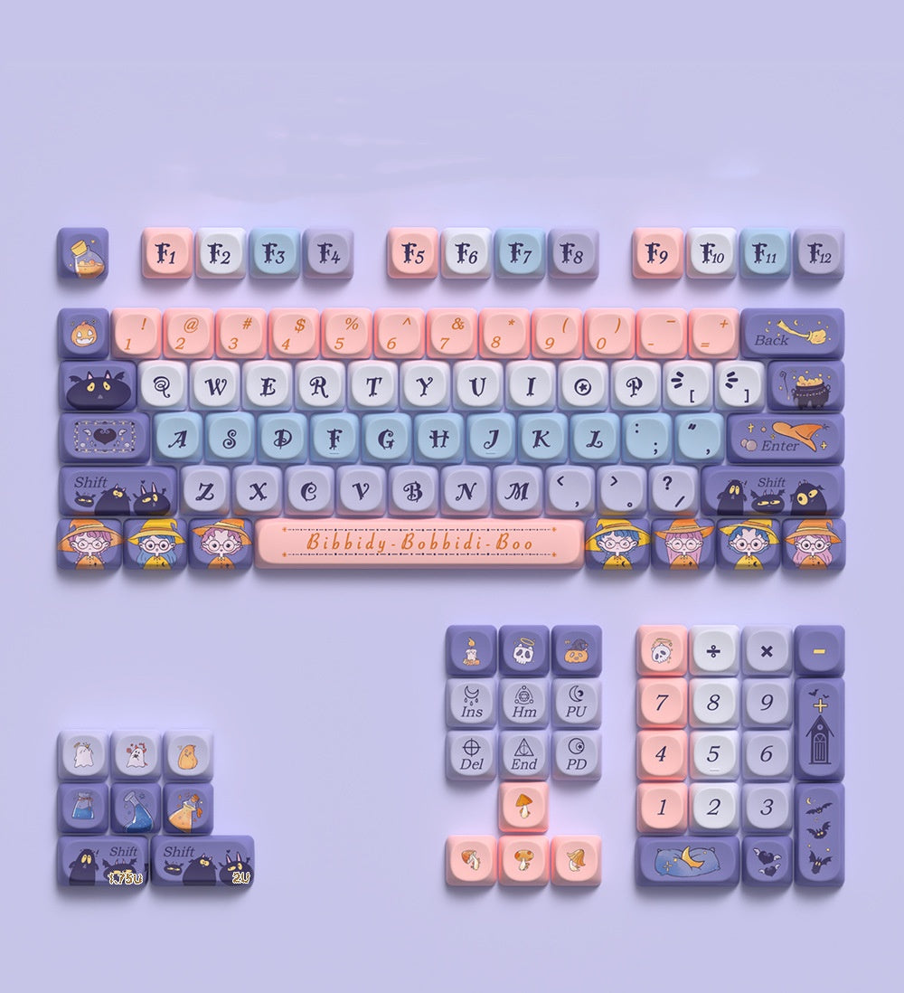Introducing our Purple Cute Witch Keycaps set, featuring 112 charming keycaps inspired by the whimsical world of adorable witches. Each keycap is adorned with playful designs and vibrant purple hues, adding a touch of magic to your keyboard. Elevate your typing experience with these high-quality and durable keycaps, perfect for anyone who loves cute and enchanting aesthetics. Let the Purple Cute Witch Keycaps set cast a spell of charm and creativity on your keyboard!