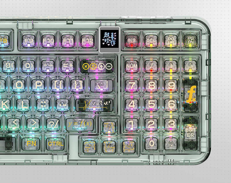 - Design: Transparent crystal-like appearance with a completely transparent chassis, keycaps, and switches.